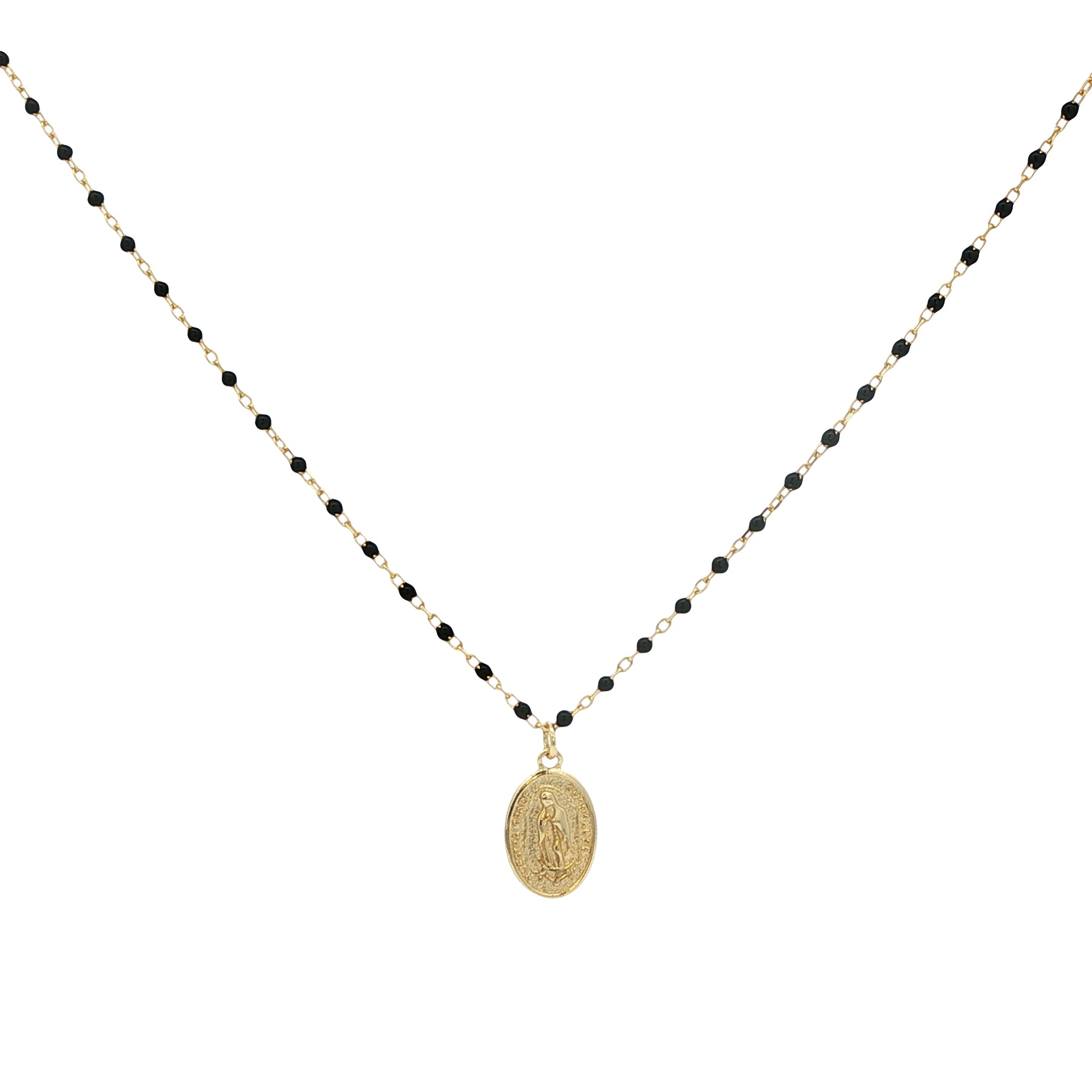 El Guadalupe Necklace celebra la fe, la devoción y la belleza del detalle artesanal. Como un rosario tiene sus cuentas, disponibles en blanco, rojo, negro o azul oscuro, se entrelazan con una medalla de la Virgen de Guadalupe hecha en bronce con baño en oro de 24k, símbolo de guía, protección y amor eterno.